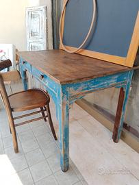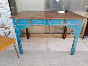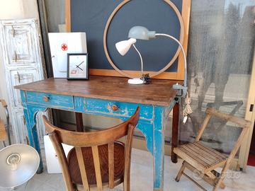 antico tavolo ho scrittoio effetto decape' con due cassetti capienti misure 120x71 alto cm80 ..si vendono anche oggetti in foto cassetta pronto soccorso in ferro con chiave 25 l'atra in bachelite €20 cerchio ginnastica legno€15 lampada morsetto €30 e bianca€30 sedia25€orologio funzionante in metallo €20 tutti oggetti vintage anni 60