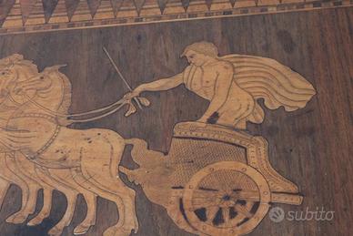 Antico tavolo SORRENTO 1860 in noce con piano intarsiato raffigurante Biga Romana . Grande qualità realizzativa. Mis 90 x 62 . h 78 . Non restaurato.