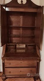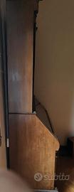 Vendo antico trumeau ribalta doppio corpo con alzata realizzato in ciliegio massello, italiano, epoca ‘800. La struttura si presenta solida ed armoniosa, e vanta proporzioni sapientemente equilibrate. E’ divisibile in due corpi, così composti: l’alzata corredata da due ante frontali e fornita di ripiani interni e la base da una calatoia, che dispone al suo interno di un piano scrittura e dei cassettini. DIMENSIONI: altezza compreso fregio 2,31m profondità max 52 cm larghezza 106,5 cm. Prezzo trattabile