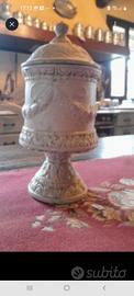 antico vasetto ceramica maiolica con interno blu smaltato, presenta belle decorazioni classiche in rilievo . restaurato sul coperchio