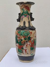 Vaso orientale in ceramica decorata a mano risalente presumibilmente all'inizio del XX secolo, raffigurante personaggi in abiti tradizionali cinesi. Lo stile pittorico ricorda la tradizione Famiglia Verde, con colori brillanti e dettagli narrativi. Presenta elementi in rilievo applicati a mano, tra cui motivi decorativi in nero a forma di animali mitologici o draghi. La superficie mostra un caratteristico effetto craquelé. Marchio impresso sul fondo, di difficile lettura,