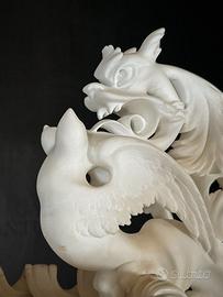 L’intera opera è realizzata in alabastro di alta qualità, alabastro di Volterra, riconoscibile per la tipica traslucenza, le delicate venature naturali e la straordinaria finezza degli intagli, elementi che attestano una manifattura di livello eccelso.