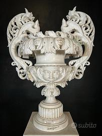 Il vaso è caratterizzato da una ricchissima decorazione scultorea: i manici laterali, finemente intagliati, raffigurano grifoni alati contrapposti, collegati da volute ornamentali e foglie d’acanto di straordinaria precisione plastica. L’orlo, ampio e movimentato, è scolpito con motivi fogliacei profondi e dinamici, mentre il corpo centrale è impreziosito da una maschera grottesca a rilievo, incorniciata da elementi fitomorfi che conferiscono forte espressività e solennità all’insieme.