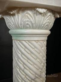 Il vaso poggia su una colonna a balaustro monumentale, tornita a spirale, con capitello e base riccamente intagliati a foglie d’acanto, impostata su un solido plinto ottagonale che ne enfatizza la stabilità e la presenza scenica.