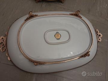 Pregiato vassoio in porcellana Limoges color bianco e rosa antico, con motivi floreali su fondo bianco e rosa ed oro zecchino con bordatura e manici finemente cesellati con fiocchi e greche in ottone, terminante con quattro piedini in forma di riccioli e volute. Completa il set , l' elegante cofanetto portagioie dipinto a mano, anch' esso targato Limoges.