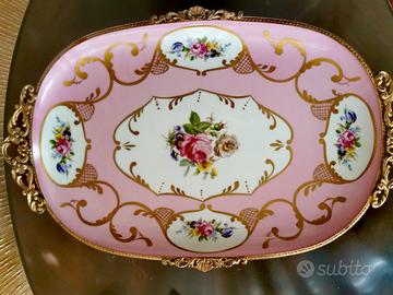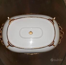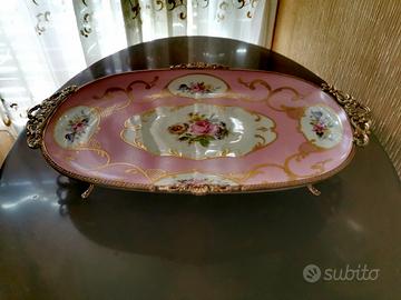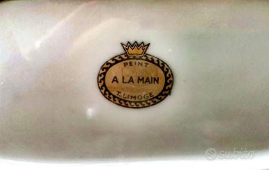 Stupendo antico vassoio stondato, alzata in autentica porcellana di Limoges, decorata a mano con smalto policromo, fiori e disegni in oro. Bordura elaborata in oro zecchino, poggiante su di una struttura ornata, modellata con fiocchi e greche, terminante con quattro piedini in forma di riccioli e volute e manici laterali. Sul retro si trova un adesivo con il marchio della manifattura "Limoges - decor a la main". E' un piatto d’epoca, pregiato di altissima qualità che darà un tocco di raffinata eleganza alla vostra tavola.