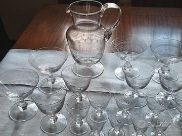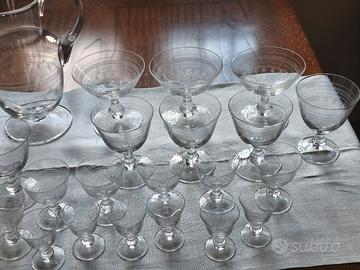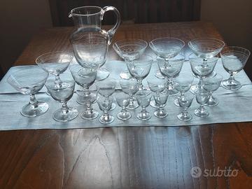 Vendo splendido e completo servizio di bicchieri d'epoca in vetro finemente lavorato/inciso, appartenuto alla famiglia da molti anni. Il set è molto elegante, caratterizzato da incisioni geometriche e floreali che gli donano un fascino retrò unico. Il servizio è composto da un totale di 24 bicchieri di diverse dimensioni e una caraffa coordinata, ideali per ogni occasione (acqua, vino, liquore): 1 Caraffa coordinata 5 Bicchieri grandi (coppe/acqua) 6 Bicchieri medi (vino) 6 Bicchieri piccoli (amaro/liquore) 6 Bicchieri mignon (da collezione/distillati) Condizioni: Il set è stato conservato con cura in armadio. Non presenta scritte o marchi visibili, ma la qualità della lavorazione è evidente al tatto e alla vista. IMPORTANTE: SOLO RITIRO A MANO: Data la delicatezza degli oggetti, NON effettuo spedizione. ZONA DI INCONTRO: Imola città.