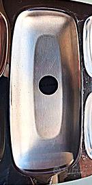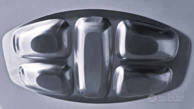 Antipastiera Alessi mod. 2400 – Disegnata da Carlo Mazzeri e Anselmo Vitale nel 1962 – In acciaio inox satinato, con bordo lucido – Presenta cinque scomparti – Al centro bollino Alessi rimovibile – Dimensioni: Lunghezza cm. 45 - Larghezza cm. 25 – Condizioni buone, con piccoli segni sull’acciaio da poco utilizzo