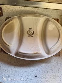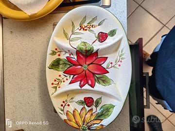 antipastiera ovale a tre scomparti in ceramica italiana, interamente realizzata e dipinta a mano (come certificato dal marchio sul retro).