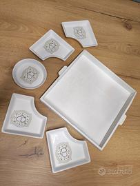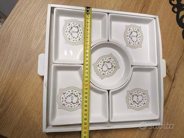 Antipastiera 5 pezzi di porcellana con vassoio in legno. Nuovo, mai usato.