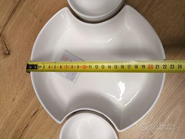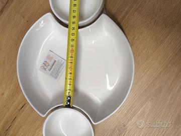 Antipastiera 3 pezzi porcellana con base in legno. Nuovo, mai usato.