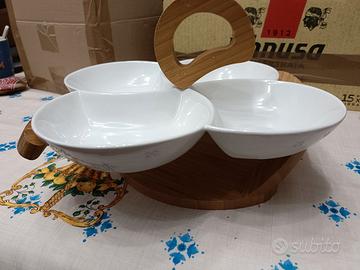 Antipastiera Brandani, ceramica bianca e base in legno. 4 scomparti ciascuno di 15 cm di diametro. Diametro totale 31 cm, larghezza max 26 cm