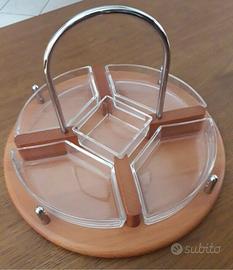 Struttura in legno massiccio, maniglia in acciaio cromato, vaschette in cristallo asportabili. Colore noce Misure in cm Altezza 22 diametro ø 32