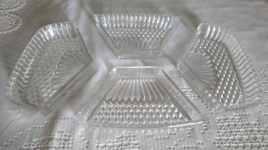 Splendida antipastiera in metallo e cristallo lavorato composta da vassoio in metallo e quattro pezzi in cristallo lavorato