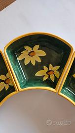 Antipastiera modulare originale Mamma Ro' prodotta a Lucca a fine anni '90, serie I Fiori di Tonja. Composto da otto ciotole a petalo in terracotta smaltata dipinte a mano con motivi di girasoli su fondo verde bosco e profili gialli. Composizione versatile, permette di creare un cerchio perfetto dal diametro di circa 60cm o disposizioni a serpentina per arricchire la tavola con un tocco di artigianato toscano d'eccellenza. Tutti i pezzi sono in ottime condizioni e presentano il marchio di autenticità sul fondo.