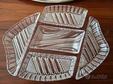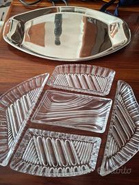 Vendo antipastiera, utilizzabile anche come vassoio per aperitivi, composta da un vassoio in acciaio inox e 5 scomparti singoli, ma componibili, in vetro.