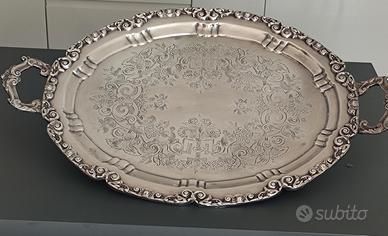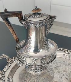 Trittico di servizio da te, in Sheffield, periodo 800 - 900, finemente sbalzato, con vassoio a completare l' insieme, di periodo sconosciuto