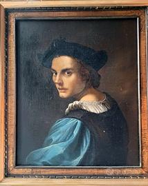 Vendo un bel dipinto olio su tela della fine del 1800. Il giovane nobiluomo è ritratto a mezzo busto, con elegante abito tipico del Rinascimento e capello. Caratterizzato da qualche tocco di colore e forme vivaci ed audaci. La veste riflette il gusto della cultura rinascimentale, mettendo in evidenza l’evoluzione europea, con la ricerca del lusso nel modo di vestire. Opera unica ed irrepetibile, difficile da reperire, la quale mette in risalto i dettagli intricati e la maestria artigianale dell’epoca. La qualità pittorica antica a strati finemente sovrapposti è eccellente. L’artista utilizza toni scuri senza ambientazione attorno al soggetto, concentrandosi sui dettagli del nobiluomo. Osservando l’opera veniamo trasportati in un’epoca passata.