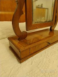 Antica specchierina da porre su un piano (tavolo, cassettiera ecc.) seconda metà '800. In legno di noce. Specchio originale, mai sostituito. Misure base: cm 43 x 15,5. Altezza complessiva cm 46,5