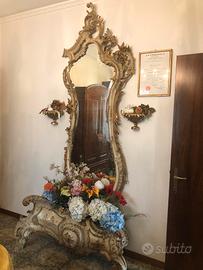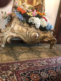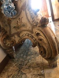 Antica specchiera con fioriera veneziana tutta originale, epoca Luigi Filippo. Lo specchio con cornice si stacca dalla base, tutta decorata con putti e angioletti e bordature oro zecchino, tutta originale.