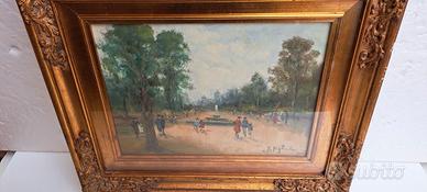 Antonio Migliardi Dipinto Olio su Tela/o Legno Quadro 60x55 raffigurante una Piazza o Villa Comunale,- cornice a rilievo decorata stile Barocco -