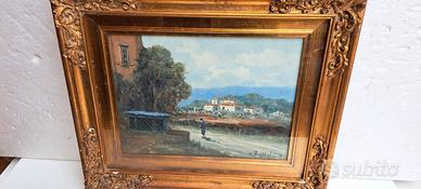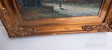Antonio Migliardi Dipinto Olio su Tela/o Legno Quadro 56x50 raffigurante un paesaggio rurale con figure,- cornice a rilievo decorata stile Barocco