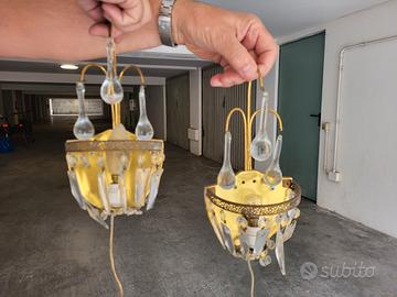 Coppia di apliques vintage da muro anni 60. Alcuni cristalli staccati, ma non rotti. Tutti i componenti integri, per cui si può restaurare.