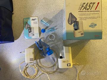 Apparecchio per aerosolterapia modello Micro Fast1, con motore a pistone di grande potenza e completo di tutti gli accessori (vedi foto). Funziona a 220V e a 12V, con presa per accendisigari da auto (compreso). Filtro nuovo. Pratico, leggero e maneggevole. Con scatola originale e pratica borsa da trasporto. Su richiesta mando breve video che dimostra piena funzionalità dell'apparecchio. Prezzo non trattabile.