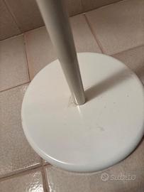Porta abiti, asciugamani, salviette, accappatoi ecc. altezza 160cm, base diametro 26cm, con sei supporti orientabili, tre di lunghezza 10cm e tre di lunghezza 36cm. Base e piantana in acciaio verniciato bianco, supporti in plastica bianchi. Completamente smontabile.