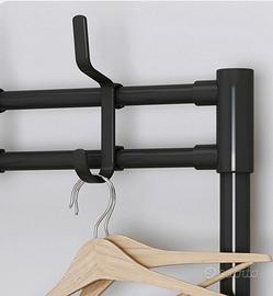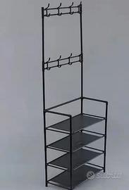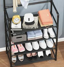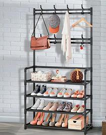 Organizzatore 3 in 1 una combinazione perfetta di scaffale,appendiabiti e panca per scarpe . così puoi appendere vestiti,borse,ombrelli e riporre scarpe,scatole di immagazzinaggio o bnorse. memorizzera' molte cose in uno spazio limitato. materiale: acciaio in carbonio e plastica resistente. 4 ripiani in tessuto plastificato waterproof. Dimensioni: 80x26x170 cm
