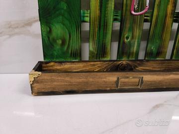 Realizzato artigianalmente a mano con la tecnica giapponese YAKISUGI per evidenziare al meglio tutte le sfumature del legno. In colore verde mare con ganci per le chiavi e comoda vaschetta per riporre piccoli oggetti.