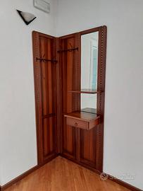 Appendiabiti angolare in legno di noce con specchio, mensola e cassetto svuotatasche. Tutti gli accessori sono posizionabili a piacimento lungo le guide in acciaio.