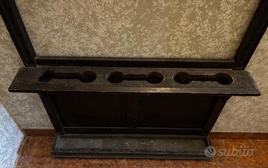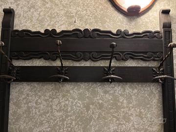 In vendita questo bellissimo appendiabiti da parete (o “hall tree” in stile inglese) in legno massello verniciato di nero/scuro, di epoca antica (probabilmente fine XIX – inizio XX secolo). Peculiarità principali: * Design elegante e decorativo: la parte superiore presenta una cornice intagliata con motivi a volute e cartigli (scrollwork) molto raffinati, tipici dello stile vittoriano o Liberty/Art Nouveau. * Ganci funzionali: 4 grandi ganci in metallo (probabilmente ottone o ferro battuto) a forma di foglia o palma, posizionati su una barra orizzontale. Sopra ci sono altri 3 ganci più piccoli e decorativi per cappelli o borse. * Portaombrelli integrato: alla base c’è un comodo ripiano con 5 fori ovali per riporre ombrelli, bastoni da passeggio o bastoni da trekking. Sotto i fori c’è un cassettone chiuso (per raccogliere l’acqua che gocciola). * Struttura solida: telaio robusto con montanti laterali decorati, due ripiani orizzontali intagliati (uno superiore e uno centrale) e base ampia e stabile. * Dimensioni: Altezza totale 218 cm – Larghezza 110 cm – Profondità base 18 cm - Altezza gancio appendiabiti 177 cm - Altezza vano portaombrelli 88 cm È un pezzo funzionale e decorativo allo stesso tempo: ideale per l’ingresso di casa, ufficio, appartamento o villa, perfetto per chi ama lo stile retrò, shabby chic o country. Può ospitare giacche, cappotti, cappelli, borse e ombrelli senza ingombrare il pavimento. Condizioni: buono stato generale, con la vernice originale un po’ consumata in alcuni punti (tipico dell’epoca), che gli dà quel fascino vissuto. Nessun danno strutturale evidente dalle foto. Punti di forza: * È da parete (non occupa spazio a terra come i classici attaccapanni a stelo). * Combina 3 funzioni in un solo mobile: appendiabiti + portaombrelli + elemento decorativo. * I dettagli intagliati a mano e i ganci a forma di foglia lo rendono più prezioso di un semplice appendiabiti moderno. * È un pezzo “statement” che dà subito carattere all’ingresso.