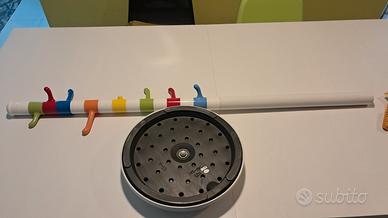 Appendiabiti modulare Ikea, modello vintage Krokig. Design di Annie Huldèn e Sanna Dalhman, stile Memphis. È alto 130 cm e ha una base di metallo pesante rivestita in plastica, diametro 35 cm. Supporto bianco realizzato in metallo e plastica. È dotato di 8 ganci colorati girevoli e regolabili, puoi decidere tu stesso l'ordine sull'appendiabiti. Tot pacco 6,8 kg