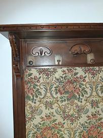 appendiabiti vintage con diversi pomoli per appendere gli abiti. tutto in legno ma foderato anteriormente in stoffa damascata. sotto, staccata, solo appoggiata è presente una grande panca in tutta lunghezza (cm 140) con apertura a coperchio. altezza del mobile cm 181 e profondità cm 43
