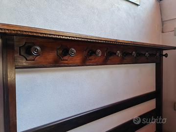 Bellissimo appendiabiti da ingresso realizzato in legno massello, completo di cappelliera superiore e panca con due listelli di sostegno. La parte frontale presenta sei eleganti pomelli torniti, montati su basi sagomate dal gusto classico.