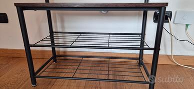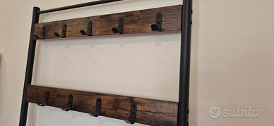 Vendo appendiabiti con rastrelliera ideale per l'ingresso, con 9 ganci, panca e rastrelliera per scarpe (almeno 6 paia). Il mobile è alto 177cm, largo 70 e fondo 32, fatto in metallo e legno marrone rustico. facile da montare.