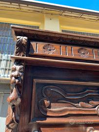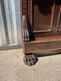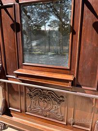 Realizzato in legno massello, presenta dettagli finemente intagliati a mano, piedini a zampa di leone, e un grande specchio centrale che aggiunge profondità e luce all’ambiente.