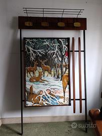 Splendido pezzo di modernariato perfettamente conservato. Struttura in metallo nero e legno con iconico arazzo raffigurante cervi nel bosco. Completo di cappelliera e ganci originali in stile space-age. Un pezzo di storia del design italiano ideale per ingressi o taverne originali.