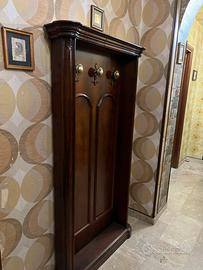 Vendesi elegante mobile appendiabiti da parete, ideale per arredare con funzionalità e stile l'ingresso di casa. Realizzato in legno massello con una calda finitura scura, il mobile presenta una struttura solida e un design senza tempo.