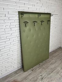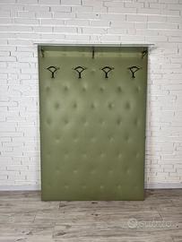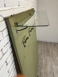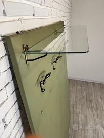 Appendiabiti da parete, anni ’60, in legno rivestito in skai verde pastello, con ripiano superiore in vetro e ganci in metallo nero, espressione del design modernista italiano del secondo dopoguerra.