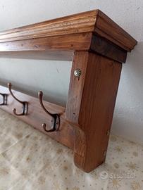 appendiabiti da parete con 6 ganci, dimensioni cm 90x20x12, lavorazione artigianale, colore noce, finitura cerata, impreziosito con ganci e copritesta in ottime ramato, staffe per fissaggio a parete, realizzabile su misura a richiesta con dimensioni e numero di ganci diverse.