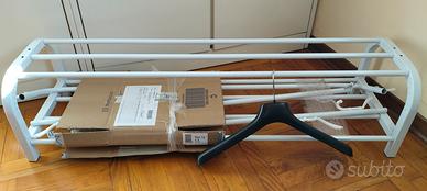 Pratico appendiabiti da terra con struttura a due livelli per riporre le scarpe. - Design moderno e funzionale. - Struttura in metallo verniciato. - Ganci integrati per appendere abiti e accessori. - Smontato, occupa pochissimo spazio (h 29 cm) - larghezza 110 cm - profondità 33 cm - altezza 150 cm