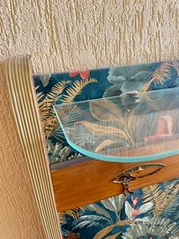 Elegante appendiabiti da terra vintage, un pezzo di modernariato che risale agli anni '50 o '60. Realizzato in legno sagomato, di faggio o noce, presenta linee curve tipiche del design Mid-Century Modern. È dotato di una pratica cappelliera in vetro temperato sulla parte superiore e di quattro ganci appendiabiti in ottone dalla forma scultorea. Il pannello decorativo centrale è stato personalizzato con un rivestimento di una carta da parati a tema giungla, per dare un tocco eclettico all’ingresso, tuttavia è facilmente removibile e al di sotto si trova il pannello originale. Misure: 183x23x112