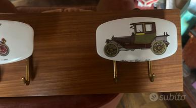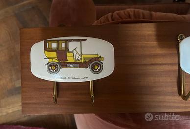L'appendiabiti è un pezzo di design italiano vintage risalente agli anni '50 o '60. I ganci ovali sono realizzati in bachelite o plastica bianca decorata con stampe di automobili d'epoca, come la Cadillac 30 Roadster del 1910 e l'Oldsmobile Curved Dash Runabout del 1903, fissati su una base di legno con ganci in ottone.