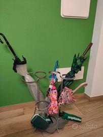 Appendiabiti a parete con scritta in corsivo e pomelli neri e porta ombrelli Arti e Mestieri
