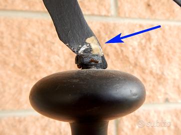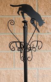 Condizioni ottime con unico difetto nella zona di attacco della zampa del gatto: la vernice nera si è scrostata come da foto. Il gatto è in ottone mentre il resto del lampadario in tubi, piattine e tondini di ferro saldato.