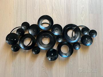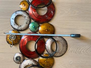 Appendiabiti in ferro smaltato, originale oggetto di modernariato, formato da cerchi colorati sovrapposti.