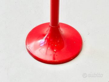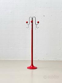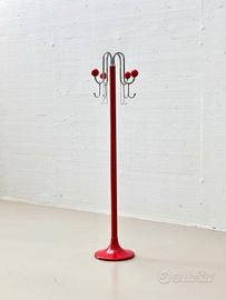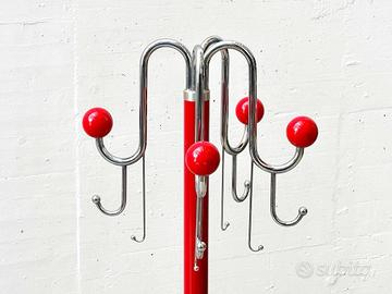 Prezzo: 423€ Elegante e funzionale appendiabiti Mid-Century dal forte carattere decorativo, prodotto da LHT Bologna e rappresentativo del design italiano del secondo dopoguerra. L'appendiabiti si distingue per il suo intenso colore rosso, uniforme su tutta la struttura: dalla base rotonda a tromba, all'asta centrale, fino alle estremità sferiche dei ganci, creando un impatto visivo deciso e iconico. I ganci in metallo cromato, disposti in modo dinamico e sinuoso, offrono numerosi punti di appoggio e conferiscono all'insieme un aspetto scultoreo. Ogni gancio termina con una sfera laccata rossa, dettaglio sia estetico che funzionale, pensato per proteggere i capi di abbigliamento da segni o deformazioni. Il design distintivo di LHT Bologna è discretamente sottolineato da un piccolo emblema posizionato nella parte superiore, elemento che ne conferma l'origine e ne aumenta l'interesse collezionistico. La base a forma di tromba assicura una buona stabilità, mentre la silhouette slanciata rende l'appendiabiti adatto sia ad ambienti domestici (ingressi, camere, studi) sia a spazi contract o interni dal gusto vintage e modernista. In buone condizioni d’uso. Sono presenti normali segni del tempo, in particolare: piccole scheggiature della vernice sull'asta, lievi graffi sulla base. Difetti puramente estetici che non compromettono stabilità né funzionalità e risultano poco evidenti nell'uso quotidiano. Dimensioni Larghezza: 46 cm Profondità: 46 cm Altezza: 167 cm
