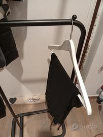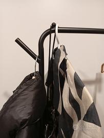 appendiabiti metallo nero con pomello legno h174xl45xp28 come nuovo. Tiene fino a 12 grucce agevolmente (con stop per evitare scivolamento) + 2 extra punti per abiti lunghi. Vendo solo per mancanza spazio.